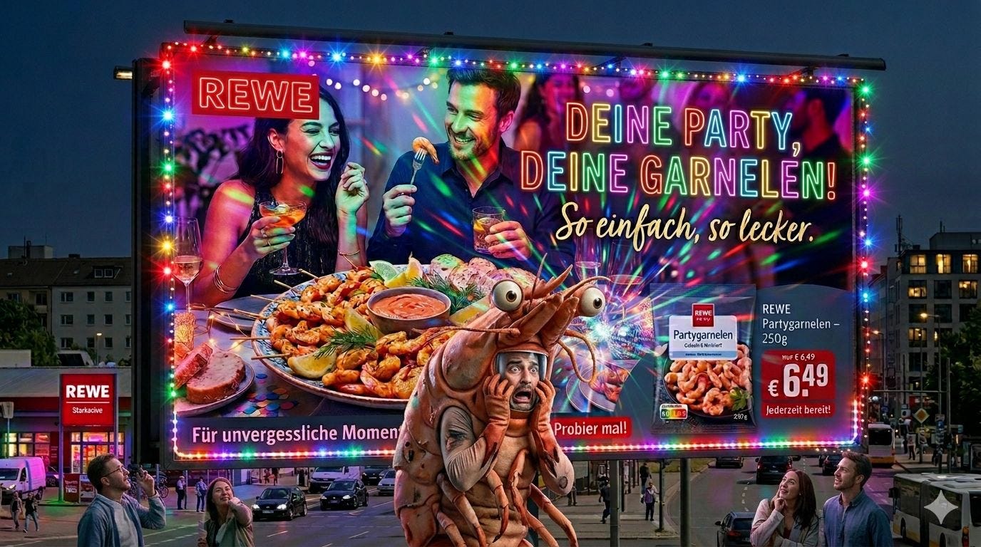 Indeed, the Party continues inside the store itself, with Partygarnelen (party shrimp) lit up with this cheerful display: