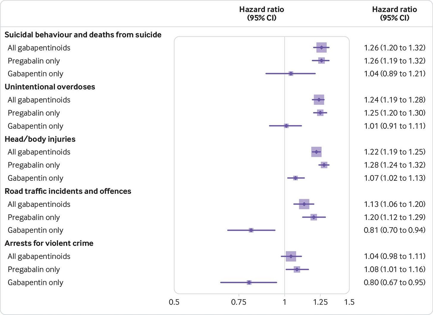 It’s not clear why this would be the case, as the drugs work in exactly the same way (as far as we know). In fact, pregabalin was found to increase suicidal behaviour/deaths from suicide, unintentional overdoses, head and body injuries, road traffic accidents and offences, and arrests for violent crime, where gabapentin had no or almost no effect (and actually reduced road traffic incidents and arrests).