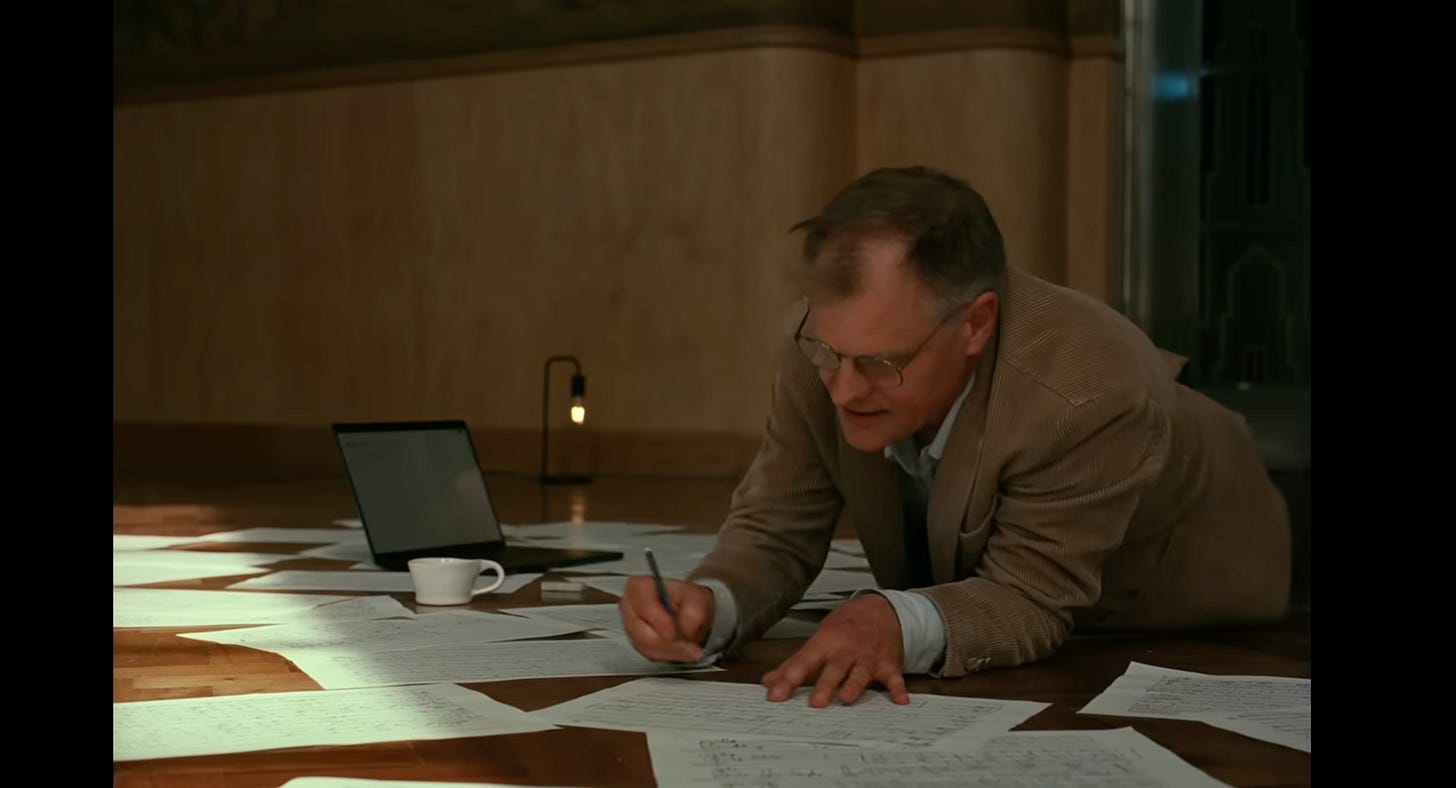 “…to be overwhelmed…” Clip of a man in a suit on the floor, surrounded by sheet music which he is marking up in front of his laptop. Looks like the man who was tuning the piano earlier.