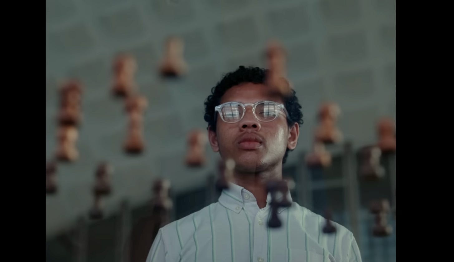 “…to be stuck…” Clip of a boy playing chess, shot from underneath a clear chessboard.