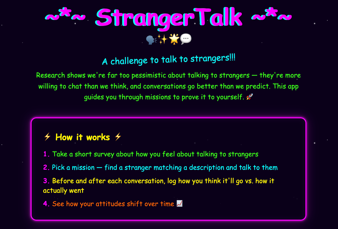 I reproduced the app from the study, abridging the questionnaires as they’re a bit tedious. It also has an ‘express mode’ so you can do it just for a day – but remember that usually doesn’t work to actually get fix your limiting beliefs around talking to strangers!