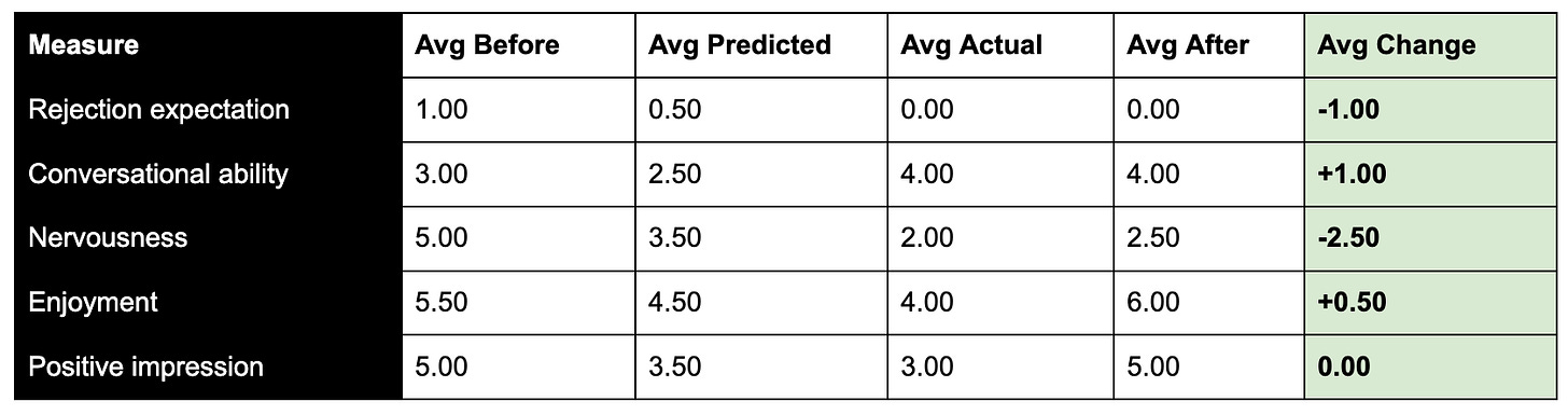 The results are good: a single conversation with a stranger obliterated nervousness, catapulted conversational confidence, and proved way less scary than predicted – exactly what the literature says will happen, every single time, and yet somehow it’s still a surprise.