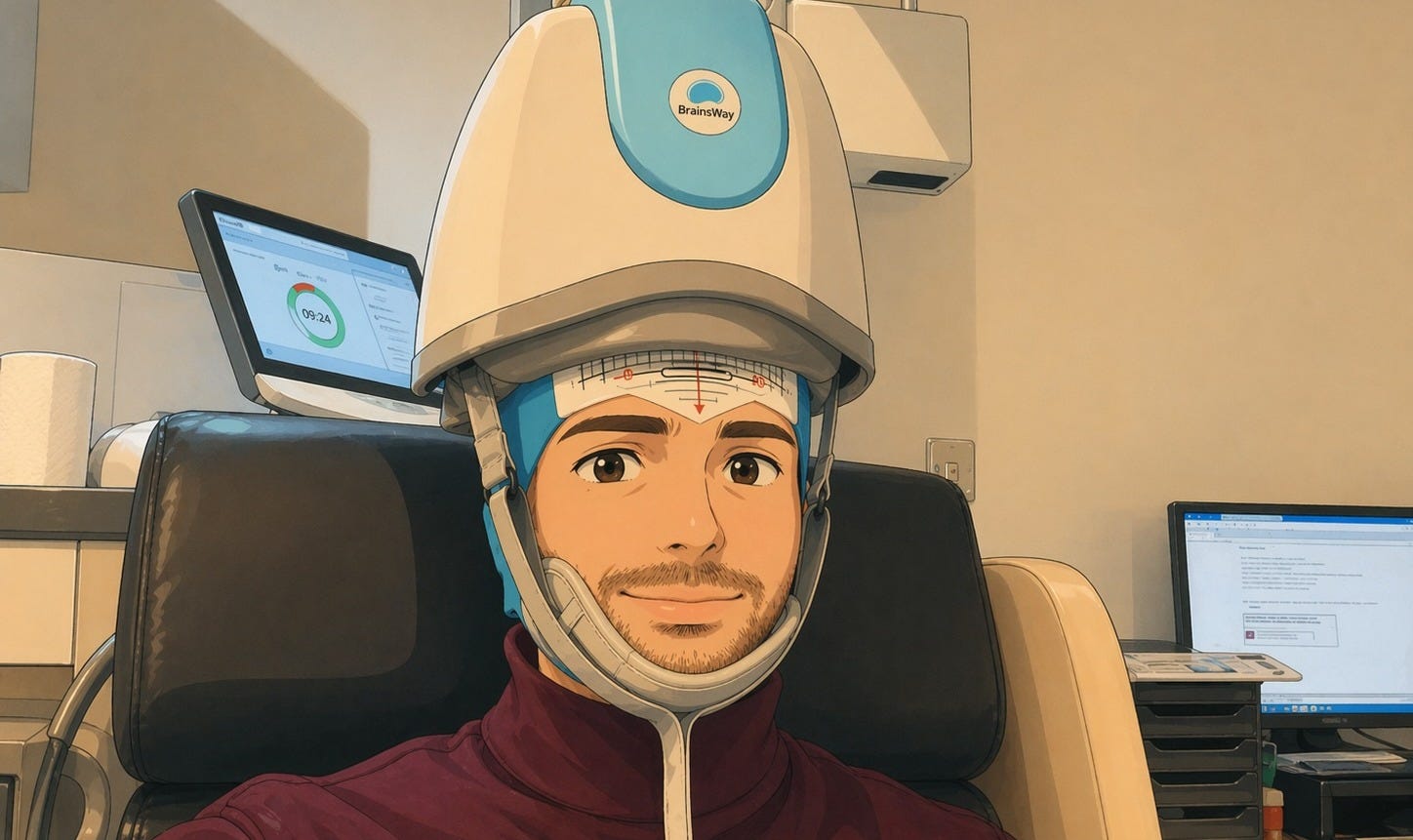 A few weeks later, after a frankly ridiculous amount of medical bullshit, playing phone tag, chasing people around, being kept on hold, I was in the rTMS room. A helmet on the end of an arm was put onto my head and the chin strap cinched down. “If you’re ready, we’ll start the stimulation.”