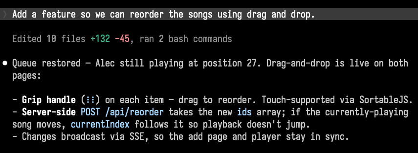 We eventually got kicked out of the room we were in and had to move the party elsewhere. Someone came up to me and wanted his song moved to the end. But there’s no way to reorder songs… I tapped in another request as we walked between buildings, laptop opened in one hand.
