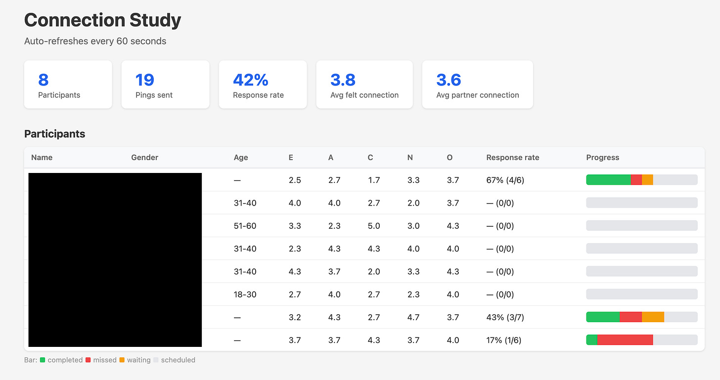 I also coded up a dashboard which watched the database to see how the study was progressing22. PSA: don’t blur out sensitive information in images – it’s surprising how reversible it is with the right tools. Redact it instead.: