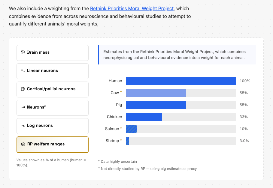 I wrote an interactive essay to explore the topic of animal welfare, drawing on the extensive research on the topic to make it easier to reason about with interactive widgets. (Still a work in progress.)