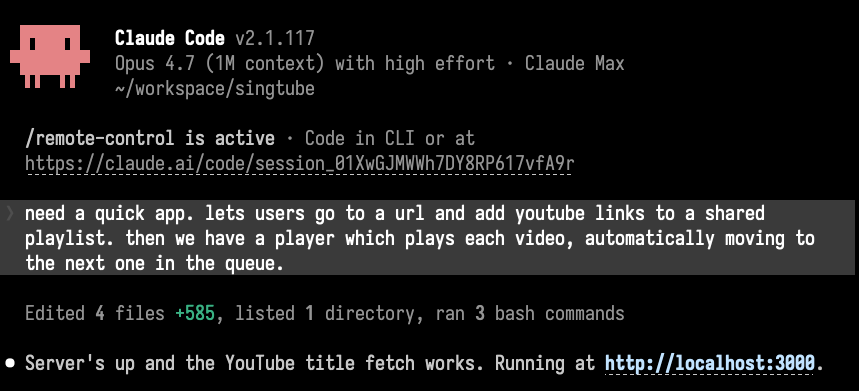 This was mostly because I’m a cheapskate and didn’t want to run it on Heroku, but actually it’s now easy enough to just point Claude at a Hetzner box and it’ll SSH on, git pull, and use docker to run the thing. Obviously you don’t get a proper pipeline with CI but for my purposes I didn’t need one.