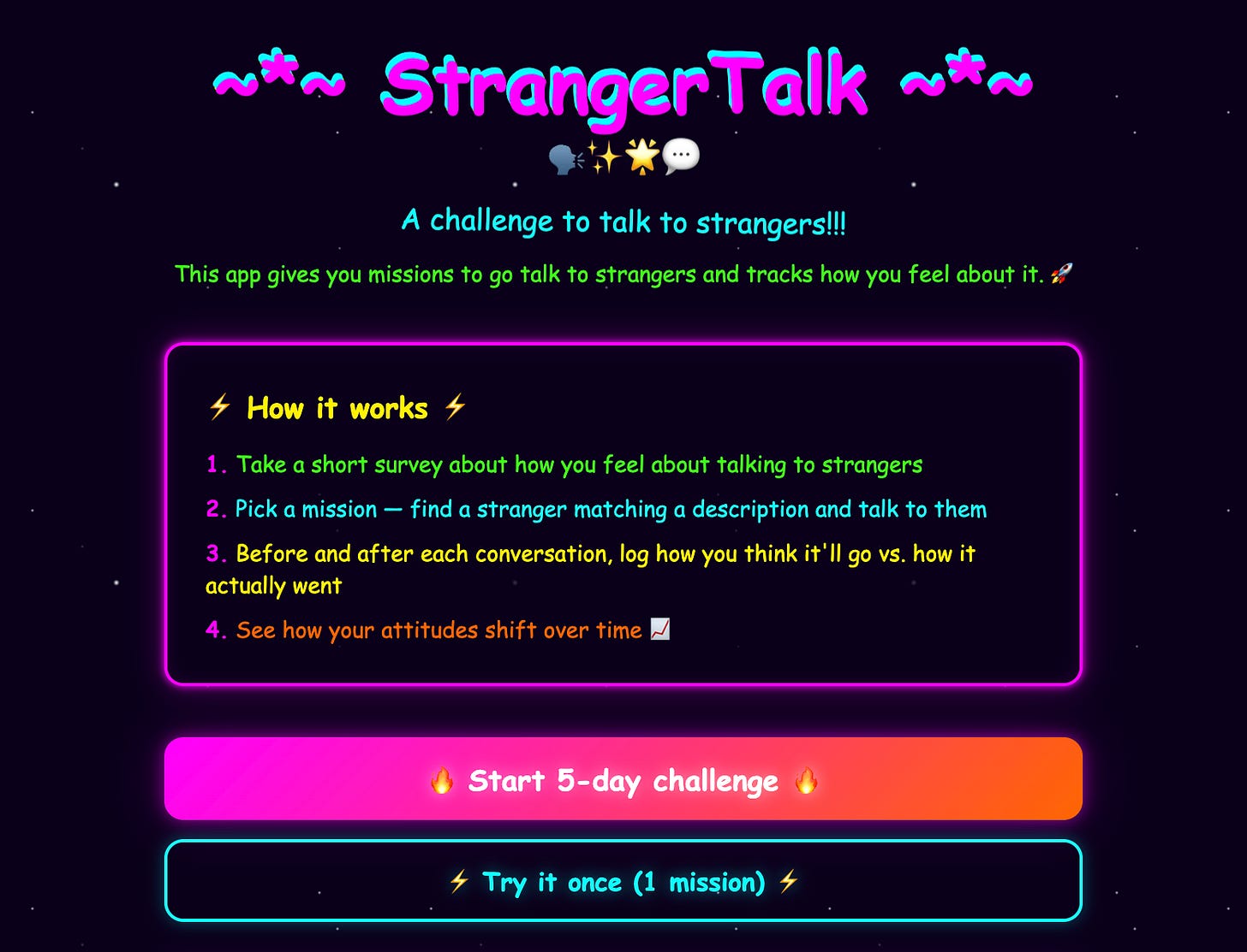 They used an app to track this and provide ‘missions’ to the participants which had them find a particular stranger to go talk to. The app isn’t public, so I coded one up and a few of us went to the UC Berkeley campus to complete our missions.